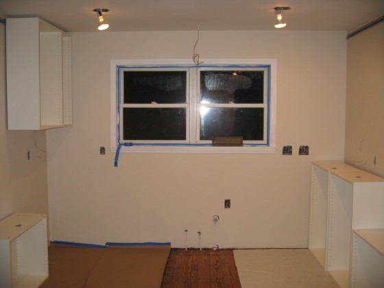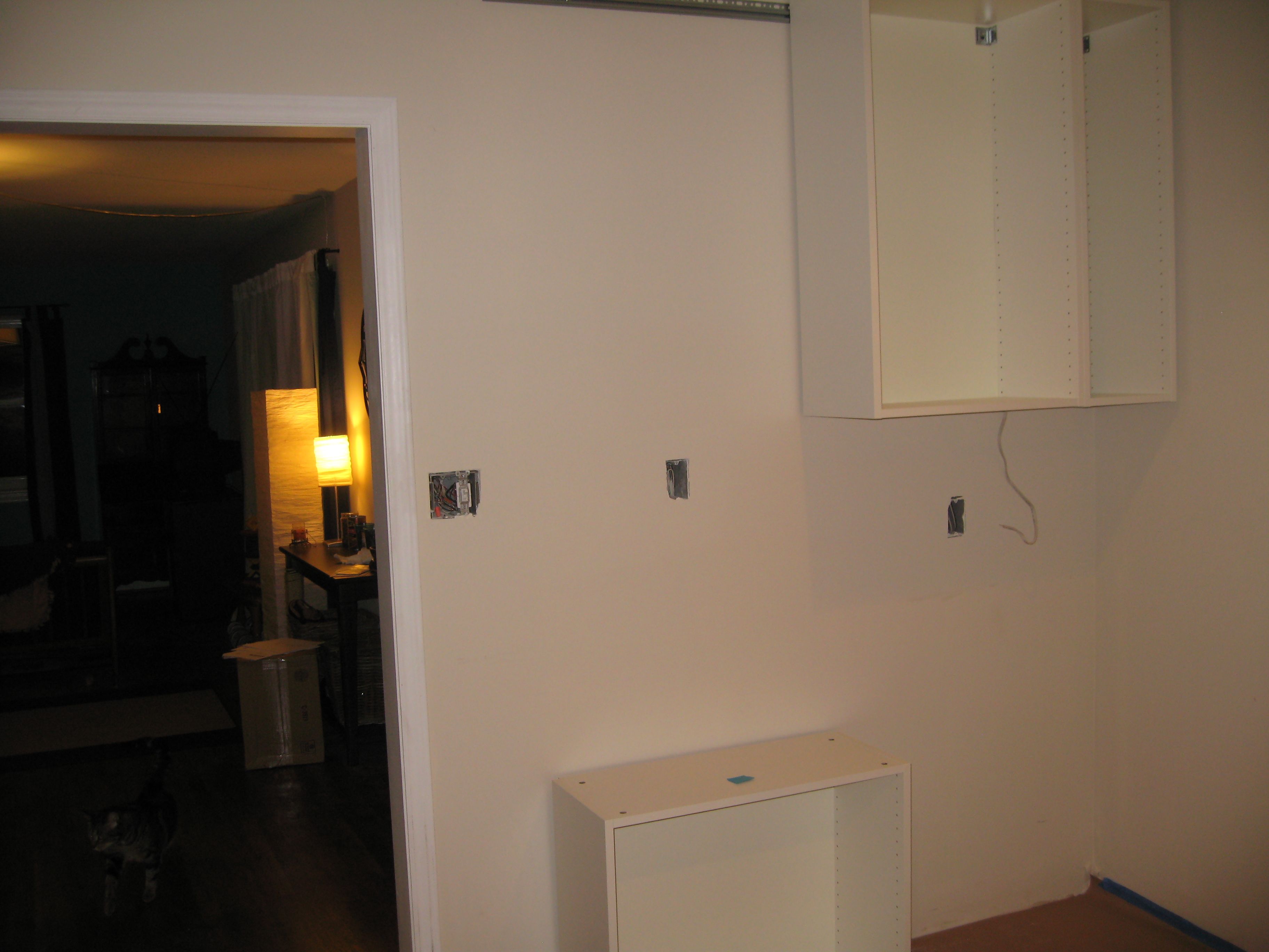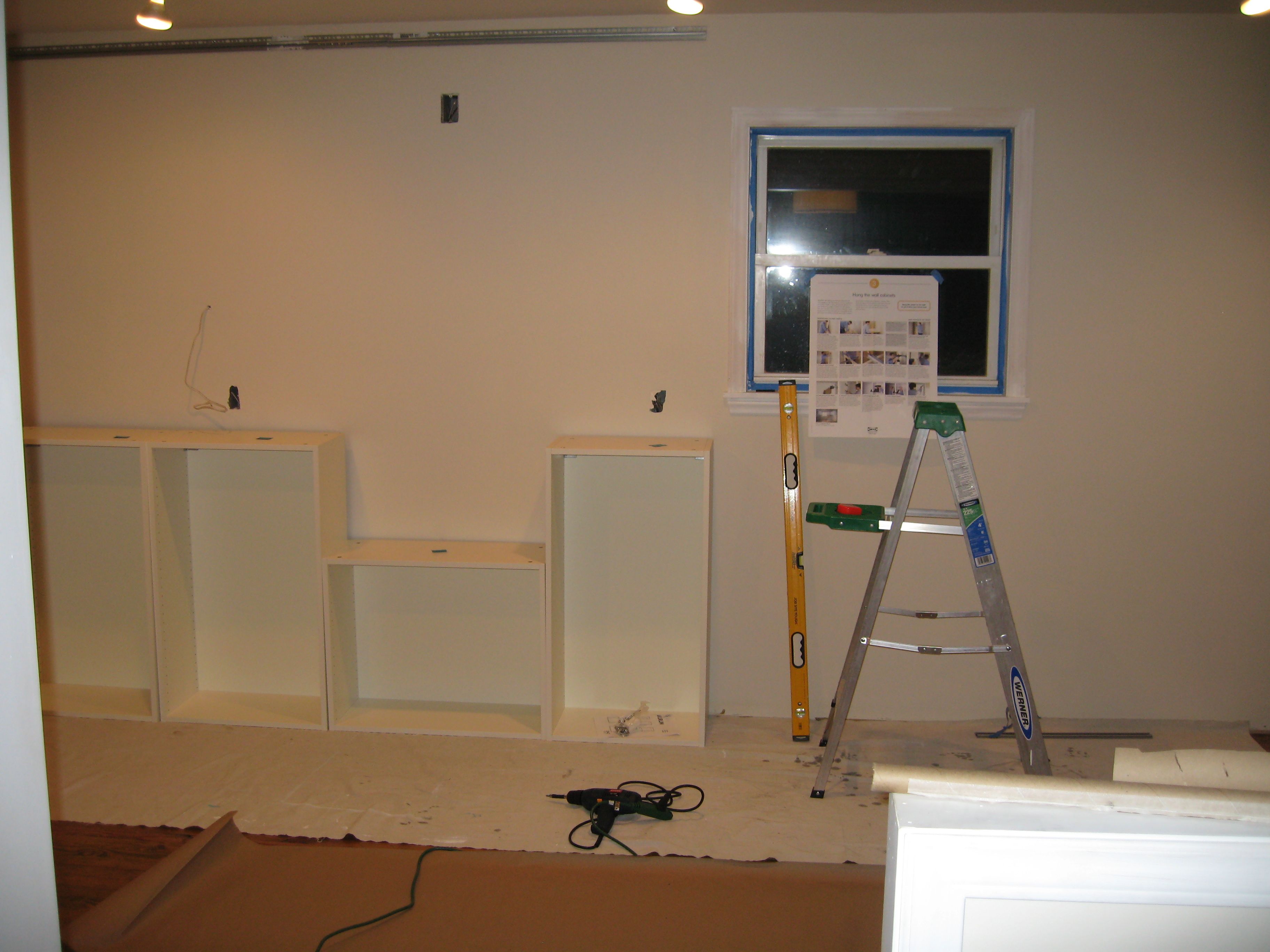 When my walls were open, I’d recorded where the studs were for future reference- well, now it’s the future, so across my level line, I marked where the studs were. Then I screwed the suspension rail to the studs with cabinet screws, making sure it was level as I went. The cabinets are hung on the rail with bolts that thread into the rail, so I put all the bolts into the rail. And then, well, I had both rails up, and all the bolts, and the cabinets were just sitting there, and it was only 9:30. So I kind of installed two of the cabinets. I’m waiting for help for the third one on that wall, just because it’s wider than the first two, and also it’s gotten late and I have to make a blog post. But I have two cabinets! They’re so exciting! The others are sitting on the floor below where they belong, waiting for their turn.