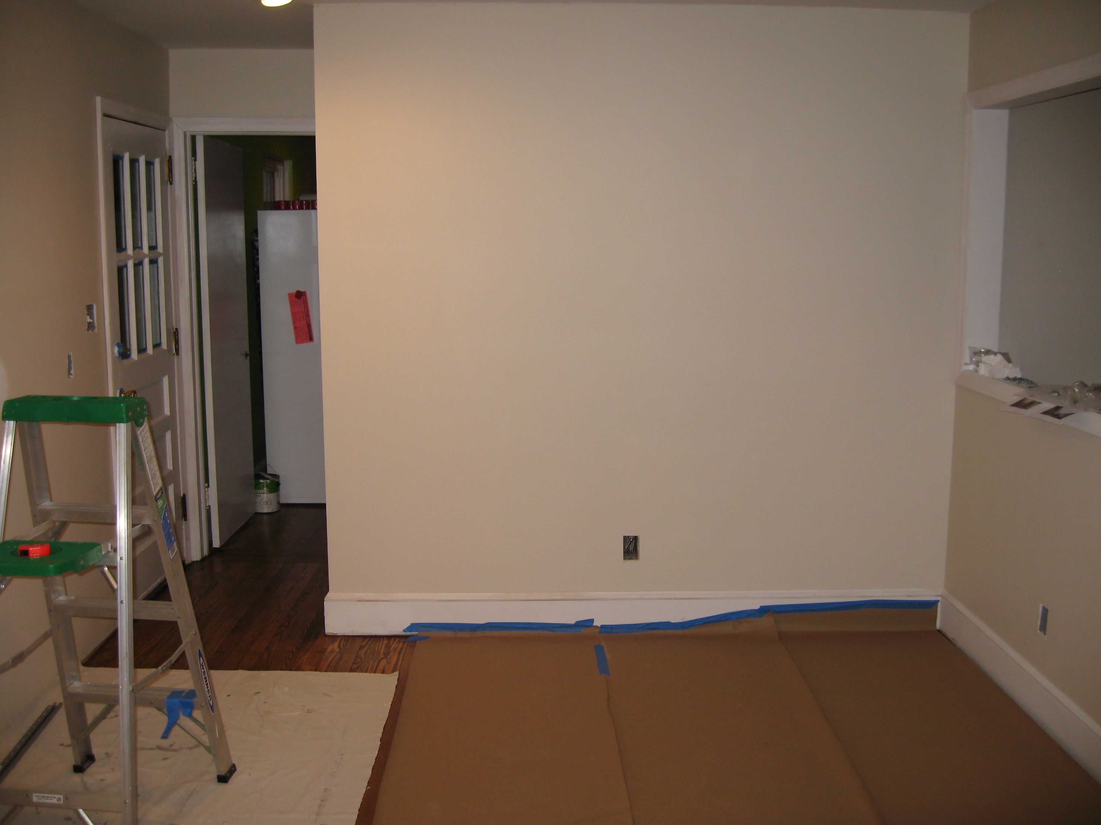 Yay, progress! Tonight when I got home from work, I covered the floor with paper – well, partially – I ran out midway through, so tomorrow I’ll go buy more, but for now I’ve got a dropcloth helping protect the floor. With that done, I brought my ladder in and checked how level my ceiling is. Surprisingly, it’s not bad – there’s a bit of wobbliness, and it was definitely possible to find a low spot for each cabinet run, but the variation is less than an eighth of an inch. Having marked the low spot, I then measured down 3.25 inches from the ceiling at that point, and drew a level line on each side. Then I got to hacksaw my suspension rails into the correct lengths, brought them upstairs, and then had to go back and cut one a second time because I can’t add. Oops.