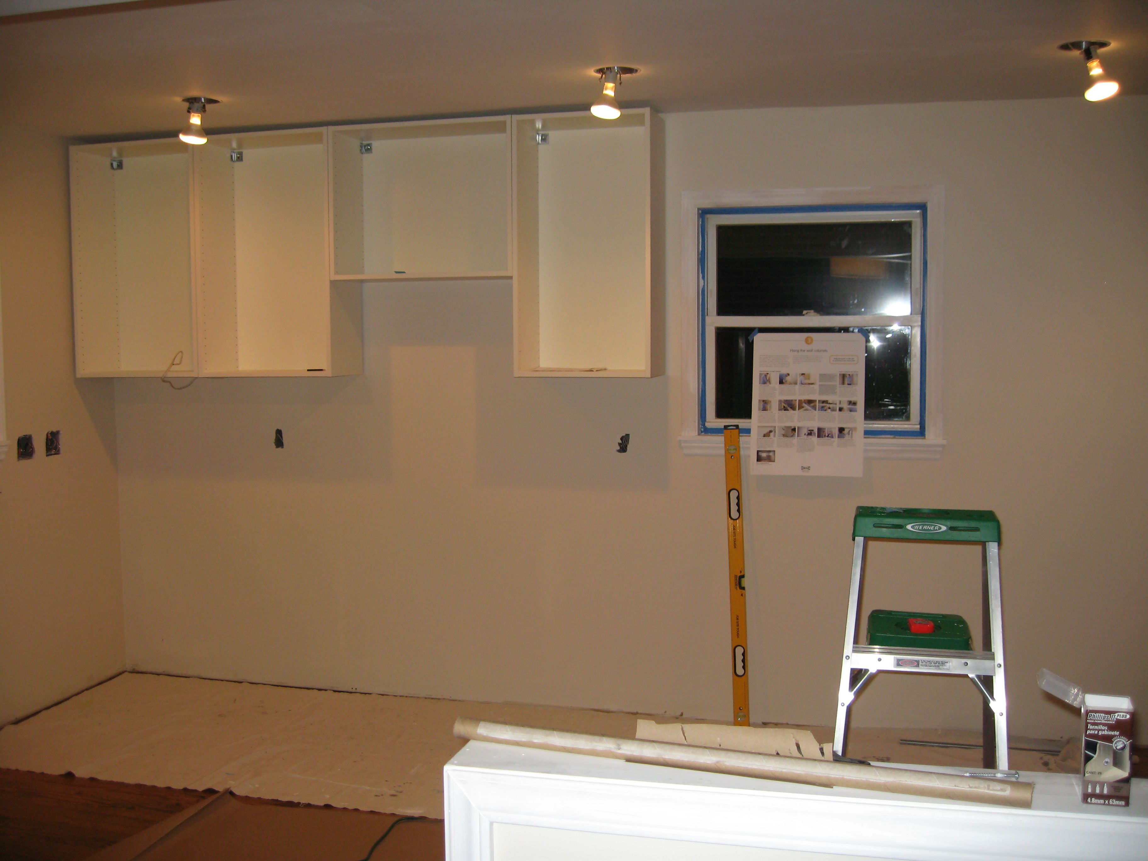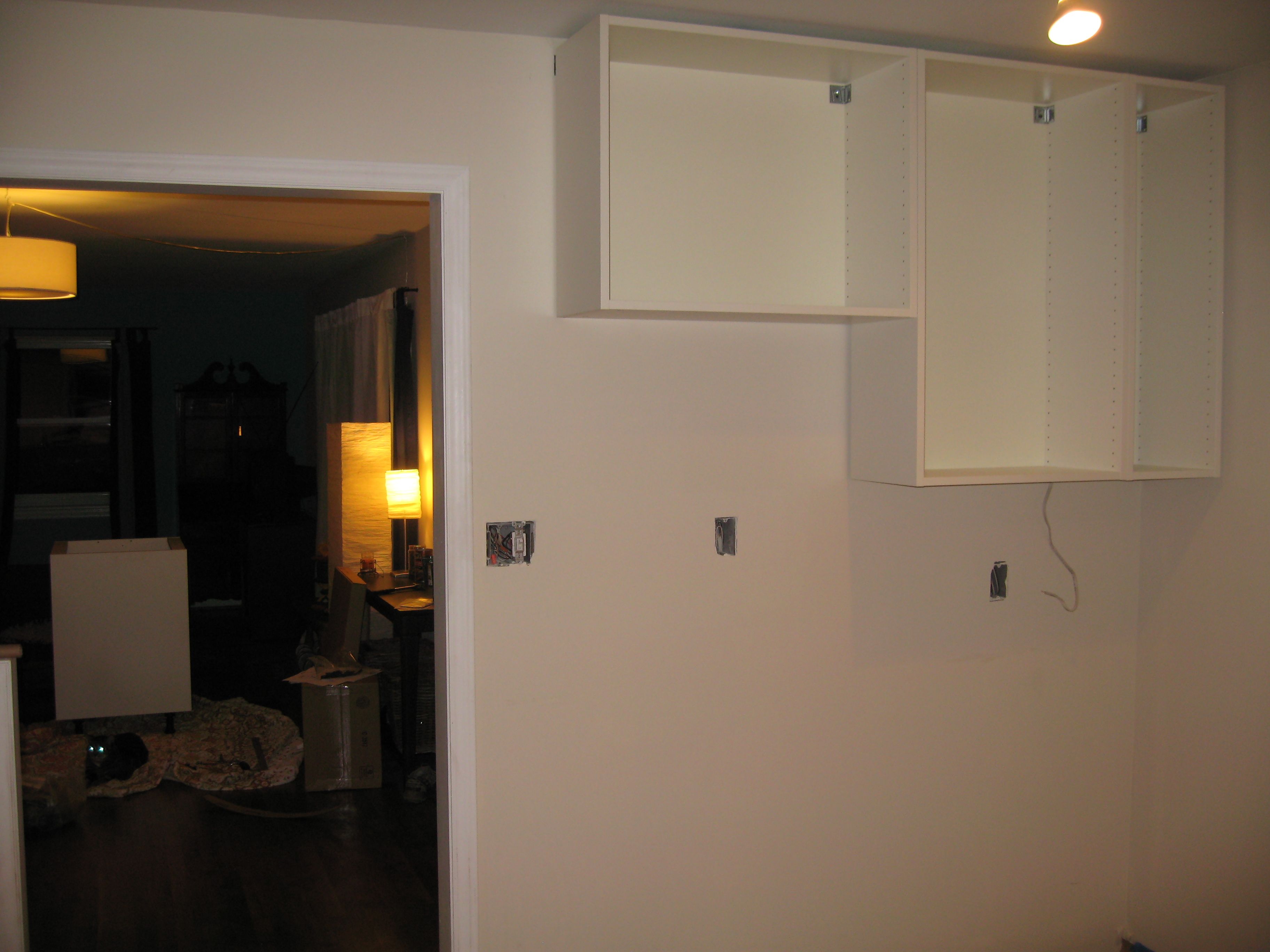 Today I mowed my lawn. Oh wait, that’s not what you’re here for. But it’s relevant, you see, because to mow my lawn, I borrowed my dad’s lawnmower, which meant my dad was at my house. And with only a very little persuasion, he awesomely agreed to help me hang the rest of the upper cabinets. So all of my uppers are up! I still have to gang them together, cut filler for the ends against the front wall (since the doors will open towards the wall, having at least a little space for them to swing is a good thing), and tighten them all. But they are on the wall, and they are awesome!
