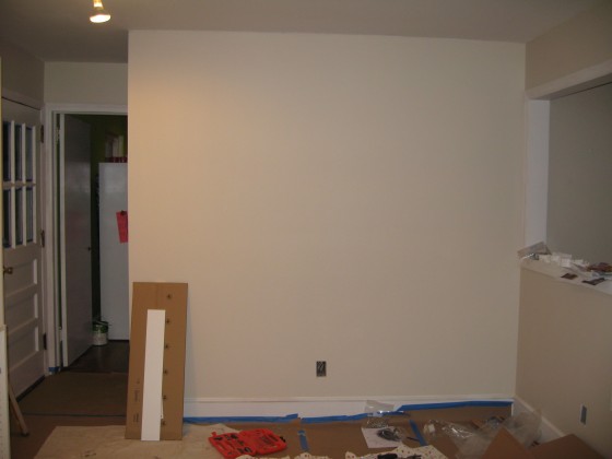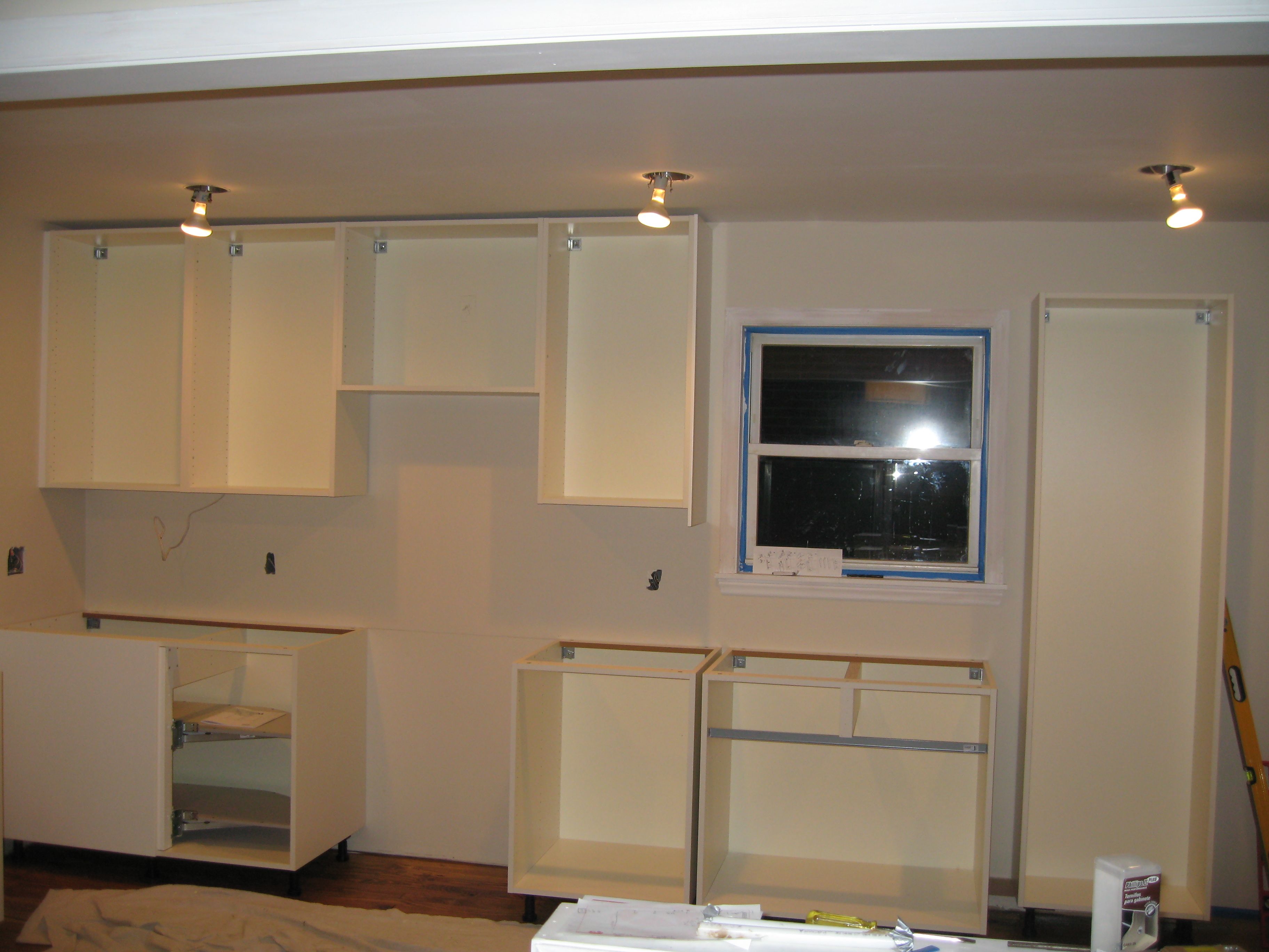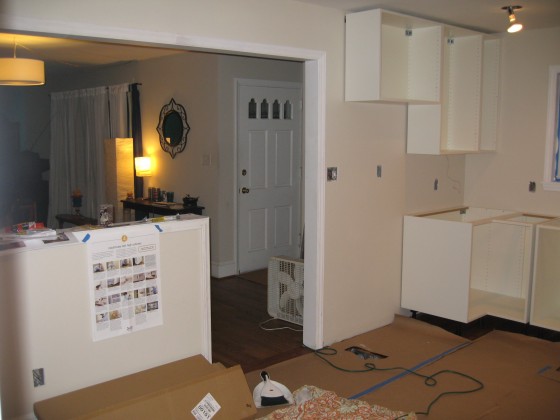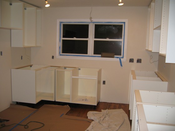 Today’s picture series is sort of amusing because it looks almost identical to yesterday’s, though messier. All those cabinets that were in place are now anchored to the wall, so they’re not going anywhere. My contractor told me to go ahead and put the sink cabinet in, they’ll re-plumb through it, so it’s anchored too, and I got the suspension rail up for the 12″ pantry so it’s got something holding it against the wall as well. I also built most of the pull-out for the blind corner cabinet, which you can see way at the left in the last photo. I haven’t put the little rails that hold stuff on the shelves yet, because it’s late and I can do that tomorrow. But all of my cabinets are in, properly mounted and leveled. My contractor returns bright and early Wednesday, so I’m hoping to do some filler and cover panels tomorrow, as well as the regular corner lazy susan, which is evidently a lot easier to install if the countertop’s not there yet.
