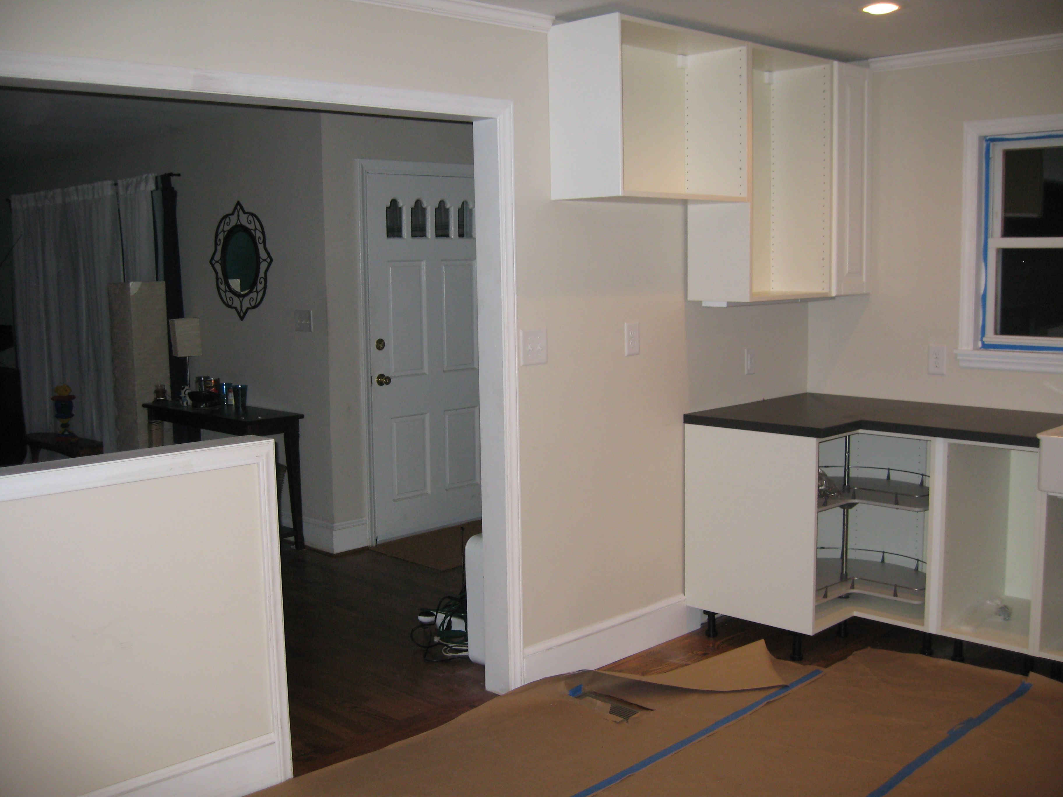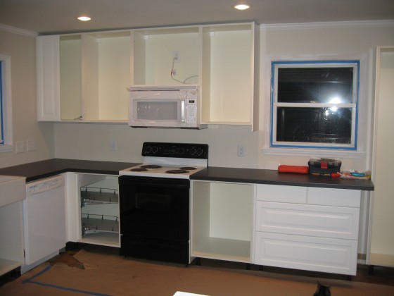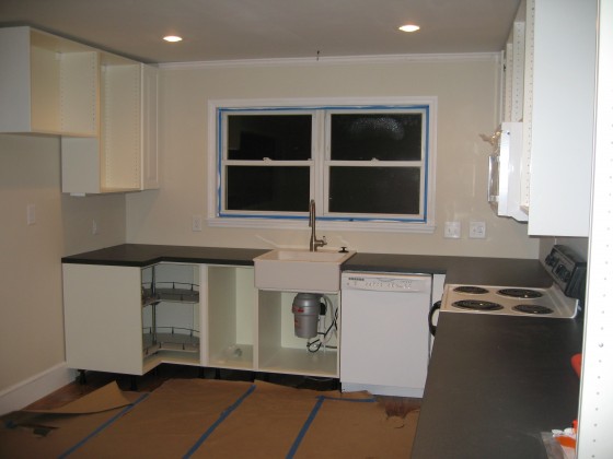 Today they also hooked up the dishwasher and installed crown molding, and I put in the filler to the right of the dishwasher so it’s enclosed. That was fun filler to install, too – I had to drill from the inside of the blind corner cabinet, so I ended up taking out the pullouts and actually crawling into the cabinet to get the angle I needed. The filler came out looking nice, so it was worth it.