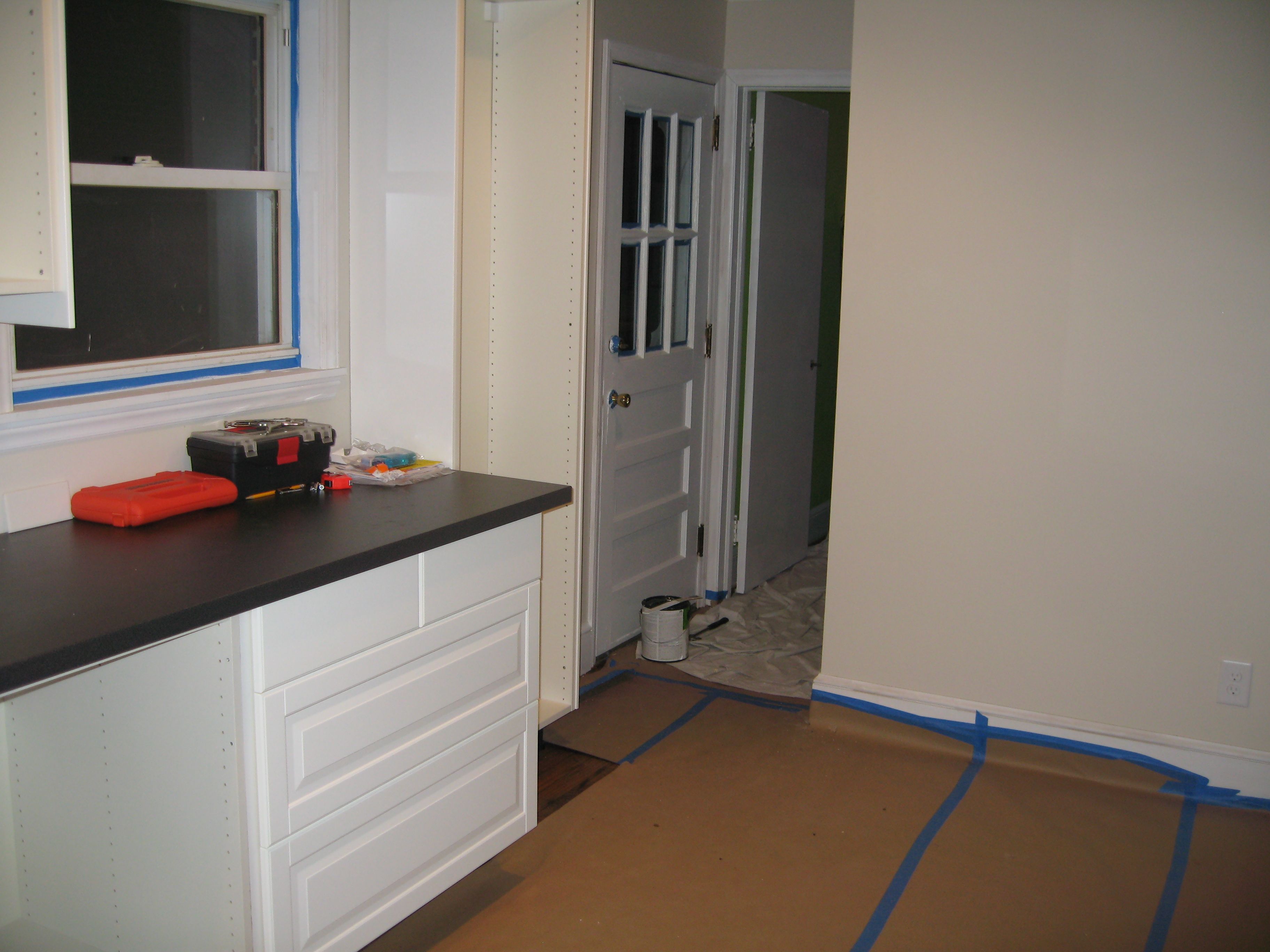 I failed at the one other piece of filler I have left- between the cabinet run and the pantry cabinet, there’s a space that’s just a tiny bit narrower than a toekick – turns out, a jigsaw is not the right tool to trim off a quarter of an inch from a 30″ long piece. I’ll go back to Dad’s tablesaw for that one.