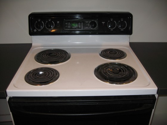 Today my stove moved back into the room! This happened a bit early, actually, since my floor guys are busy for the next two weeks, so the final coat of poly on the floor won’t go on ’til two Wednesdays from now, and so I decided that the stove doesn’t really need that final coat underneath it – I’d rather have my kitchen back.