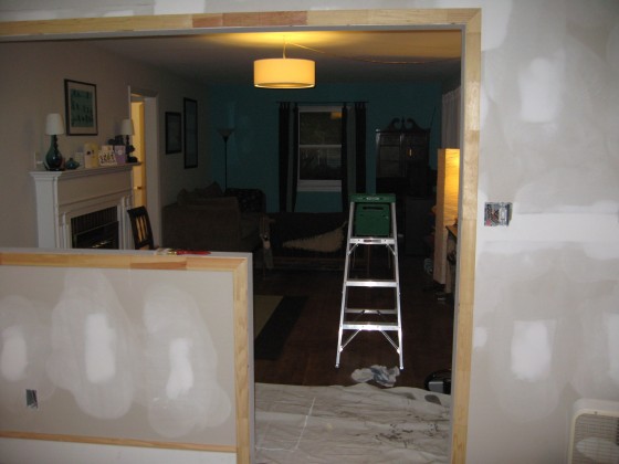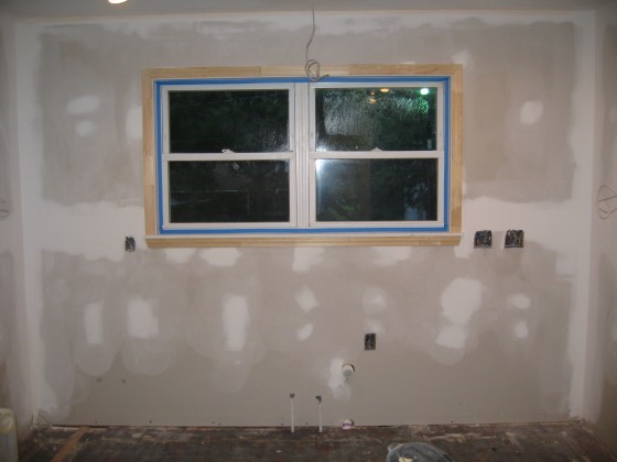 Well, what I’ve been thinking of as phase 1 of this project is complete – I have walls, trim, and a big empty room in which to put cabinets. Now my contractor gets to go do something else for a couple weeks while the painting, floor, and cabinet installation get done (also known as phase 2). So this is what my kitchen looks like today – tomorrow, I paint!