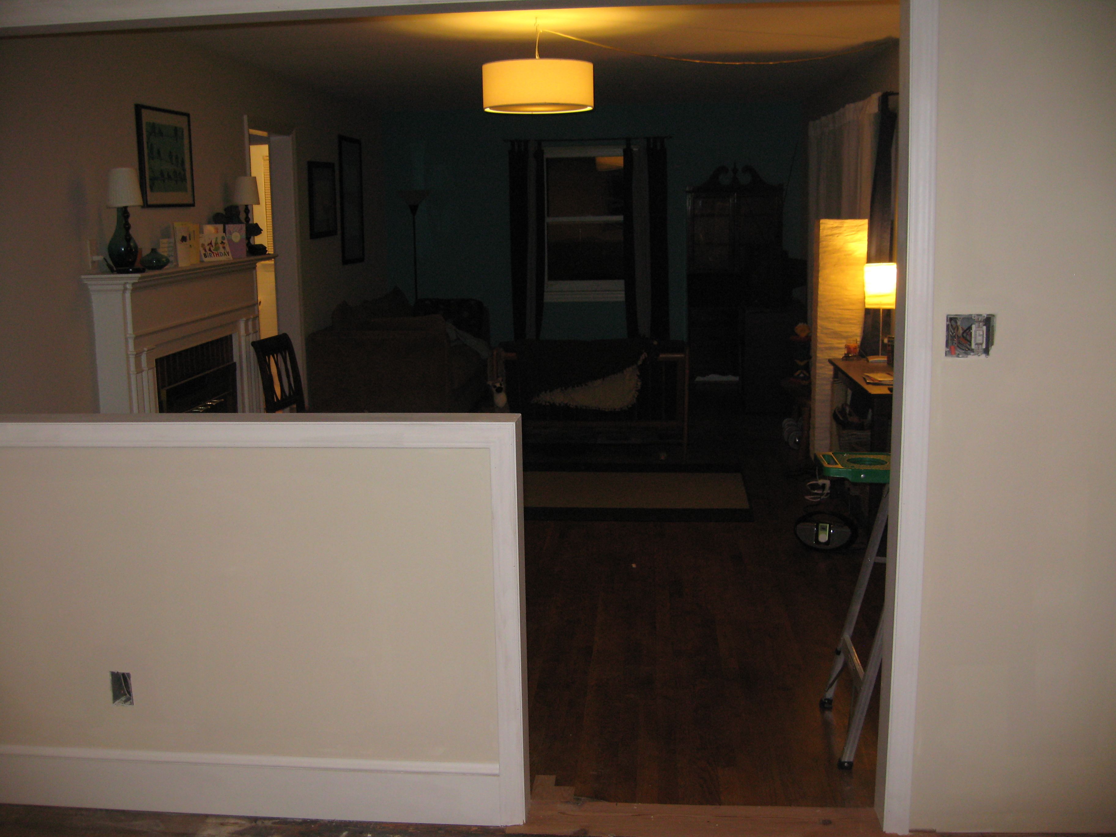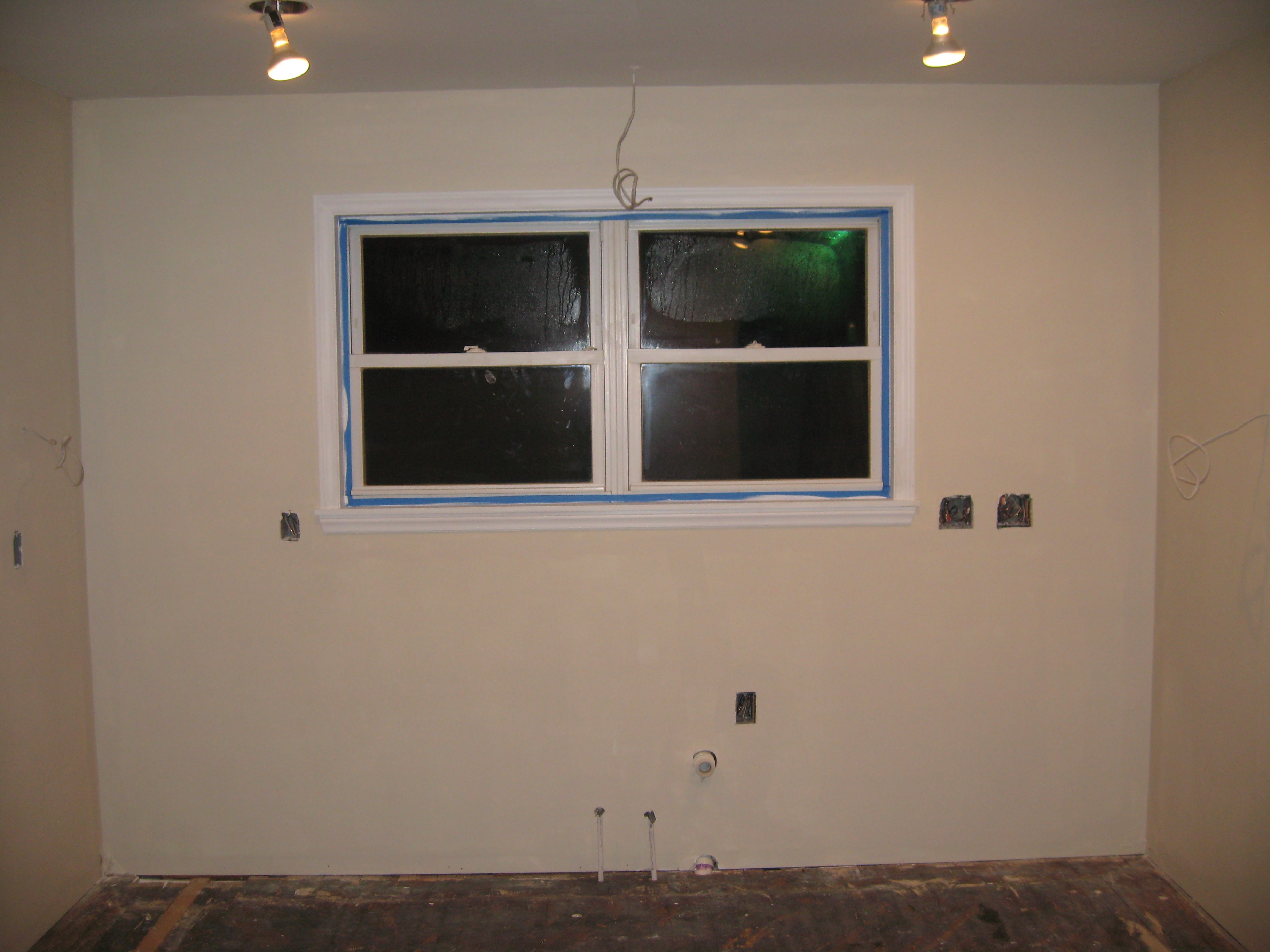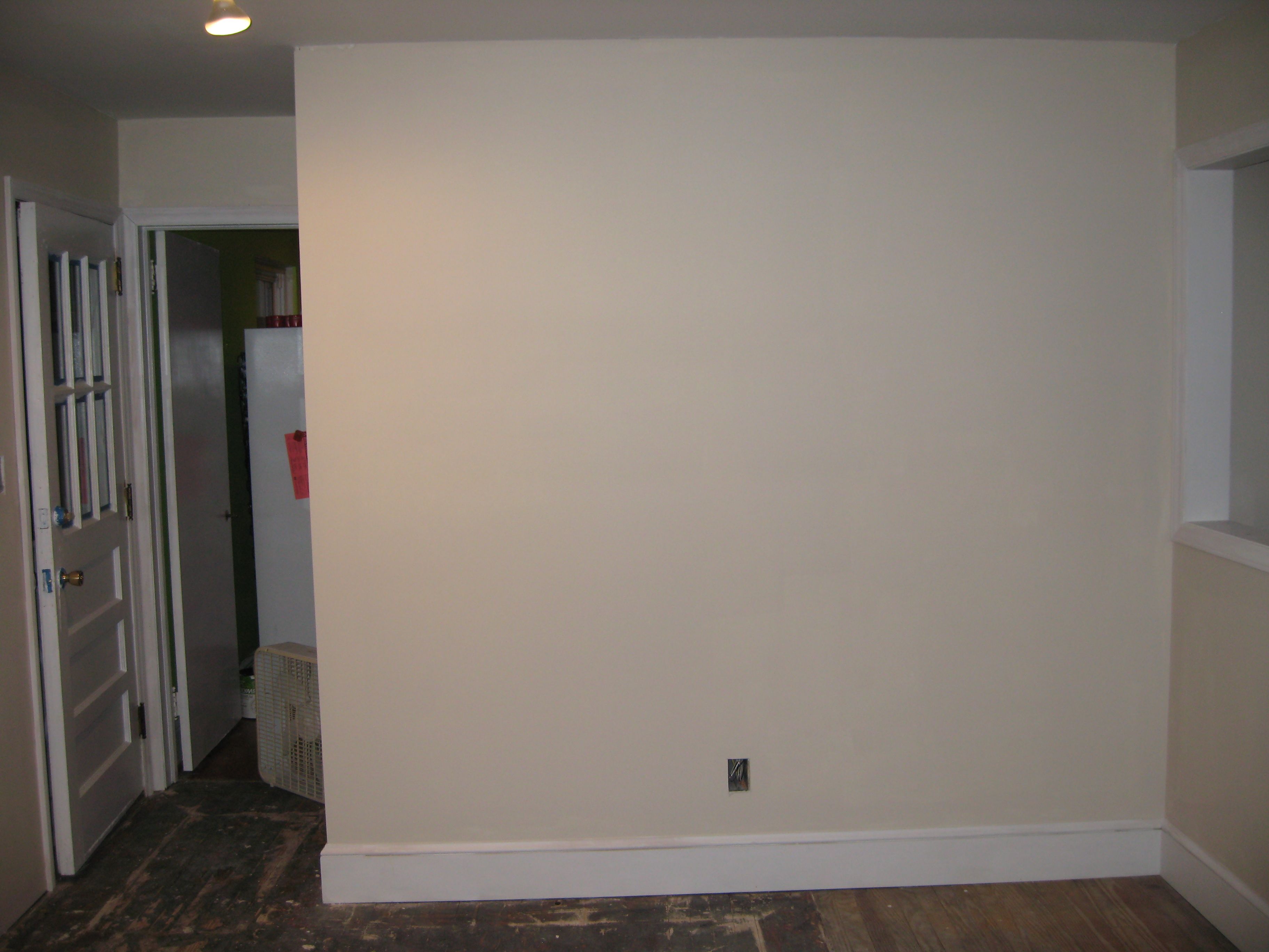 Today was pretty productive, considering I didn’t actually start anything until 4:00. I’m always happy when I remember how much nicer paint is than primer – primer gets everywhere and spatters and glops and is always really annoying, so switching to paint is a relief – it goes on nice and smooth and is pretty. Admittedly, I only got to do one coat today, so though it’s hard to see in the photos, it’s not actually pretty yet, it’s more haphazard strips where it’s thinner so you can see the primer coming through, and brushstrokes at edges and general weirdness, but at least if you squint, the room’s starting to look like part of the house instead of some strange other place (my eldest sister once called it “the land of knotty pine”). So here are today’s progress photos, where the walls have been painted tan, but nothing else has changed…