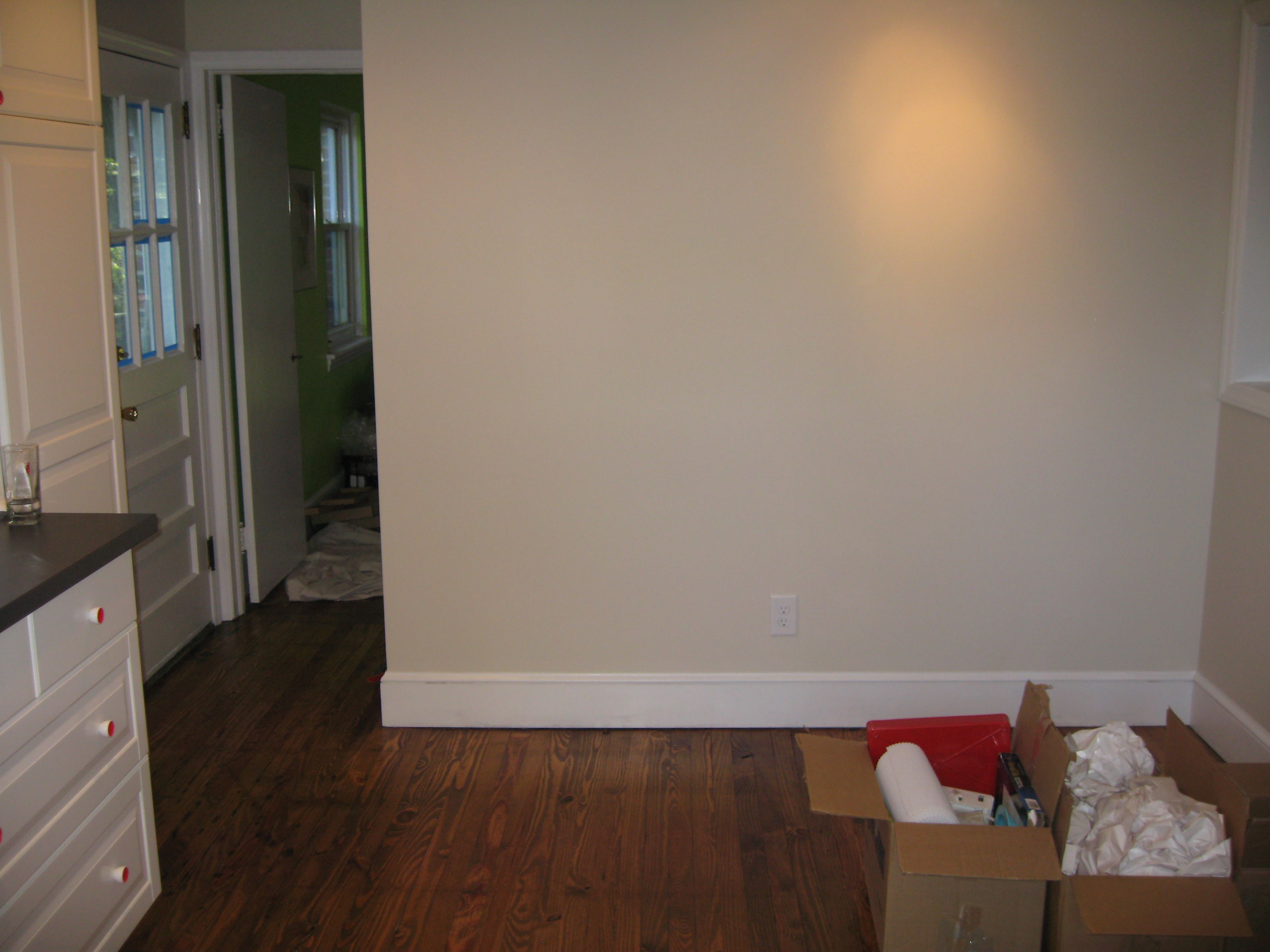 If you squint, you can see that there’s an outlet on the back wall. There’s another at exactly the same height on the half-wall too, and they were both exactly at the height I wanted to attach a 2×4 as the back support for the banquette. So this stalled me out for a while, as I tried to decide what to do: move them down a few inches, trapping them behind the banquette once it was built? Hire an electrician to move them all the way to the ends of the walls where they wouldn’t be behind the banquette anymore? I hadn’t planned for this project to involve electrical. So I stopped. For… more than a month.