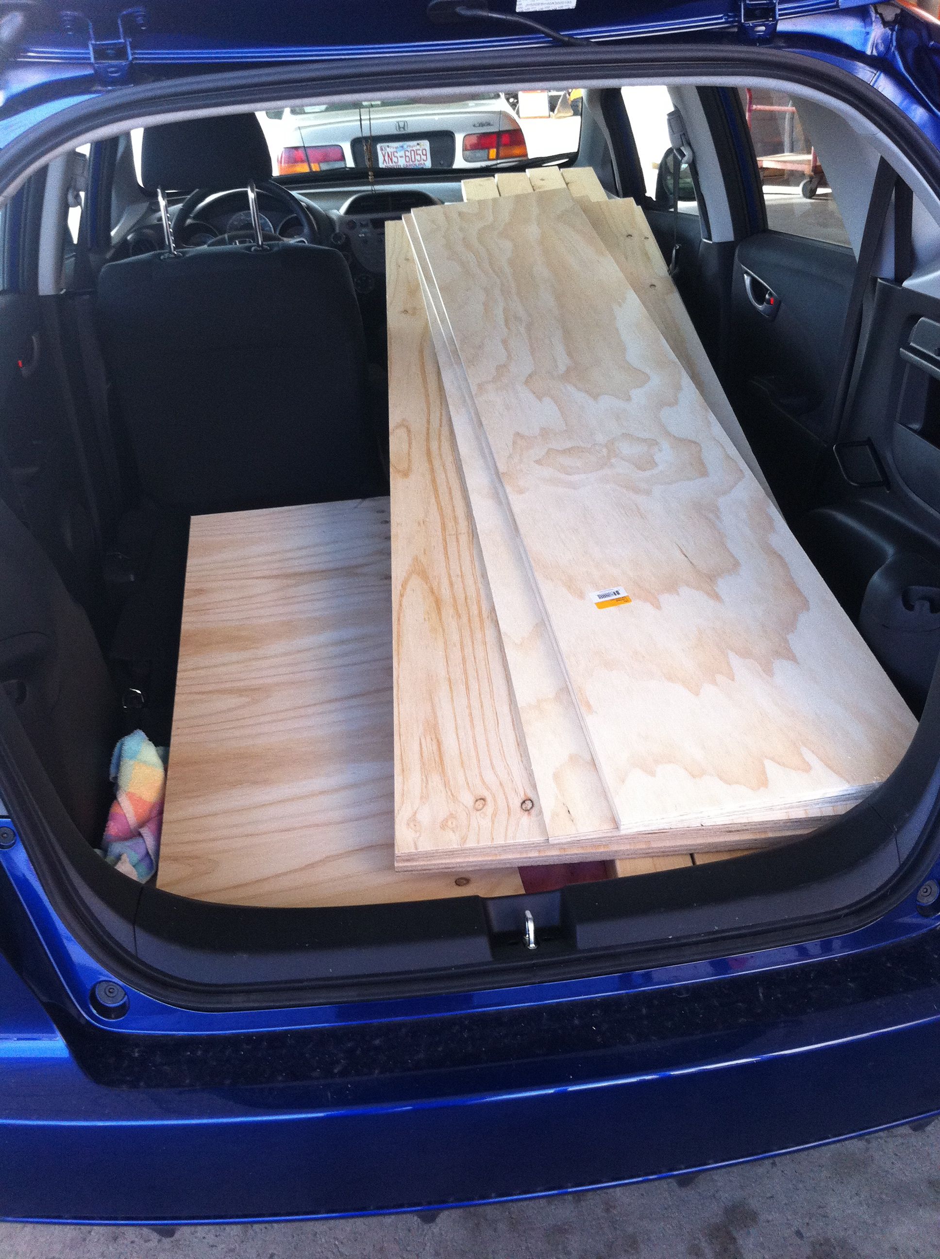 Once I had a pretty good design laid out, with measurements to make sure it wouldn’t narrow the traffic flow through the doors, I went to Home Depot and bought nearly $100 of wood, which a really nice guy there even cut into my required sizes (largely so it’d fit in my car, which won’t hold a piece of plywood that’s 4′ x 8′. Here’s my car with a lot of wood in it: