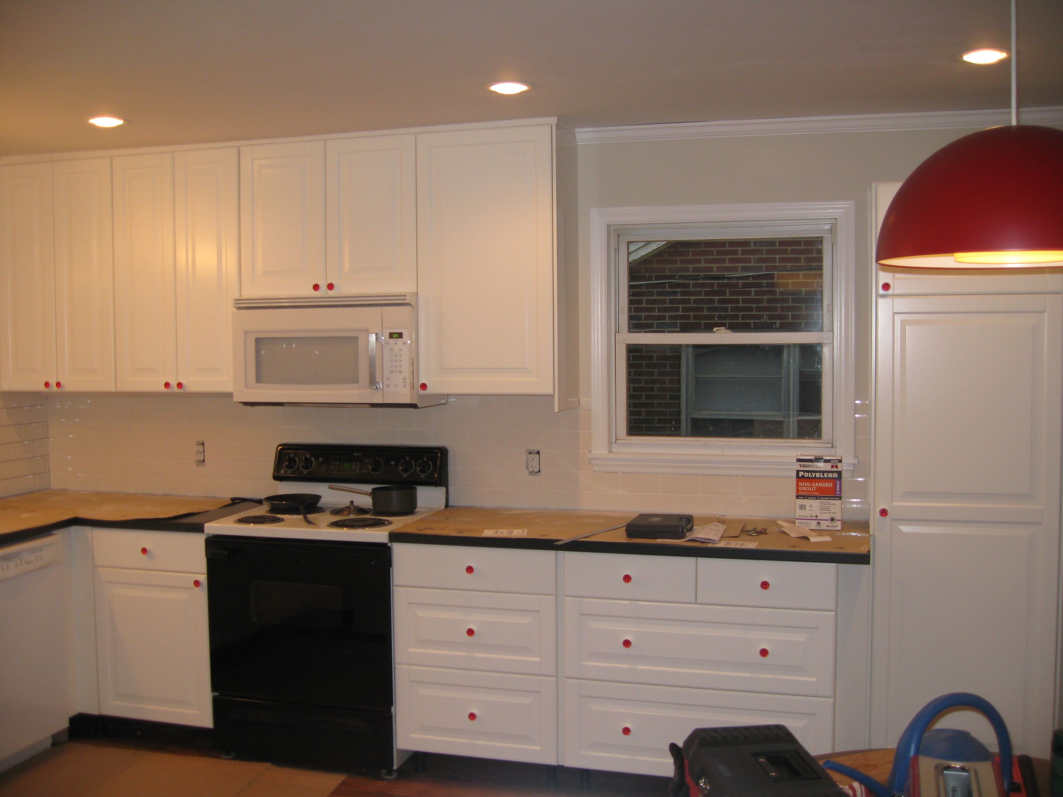 It’s looking great! I love the pops of red with the cabinet pulls and the dome light.