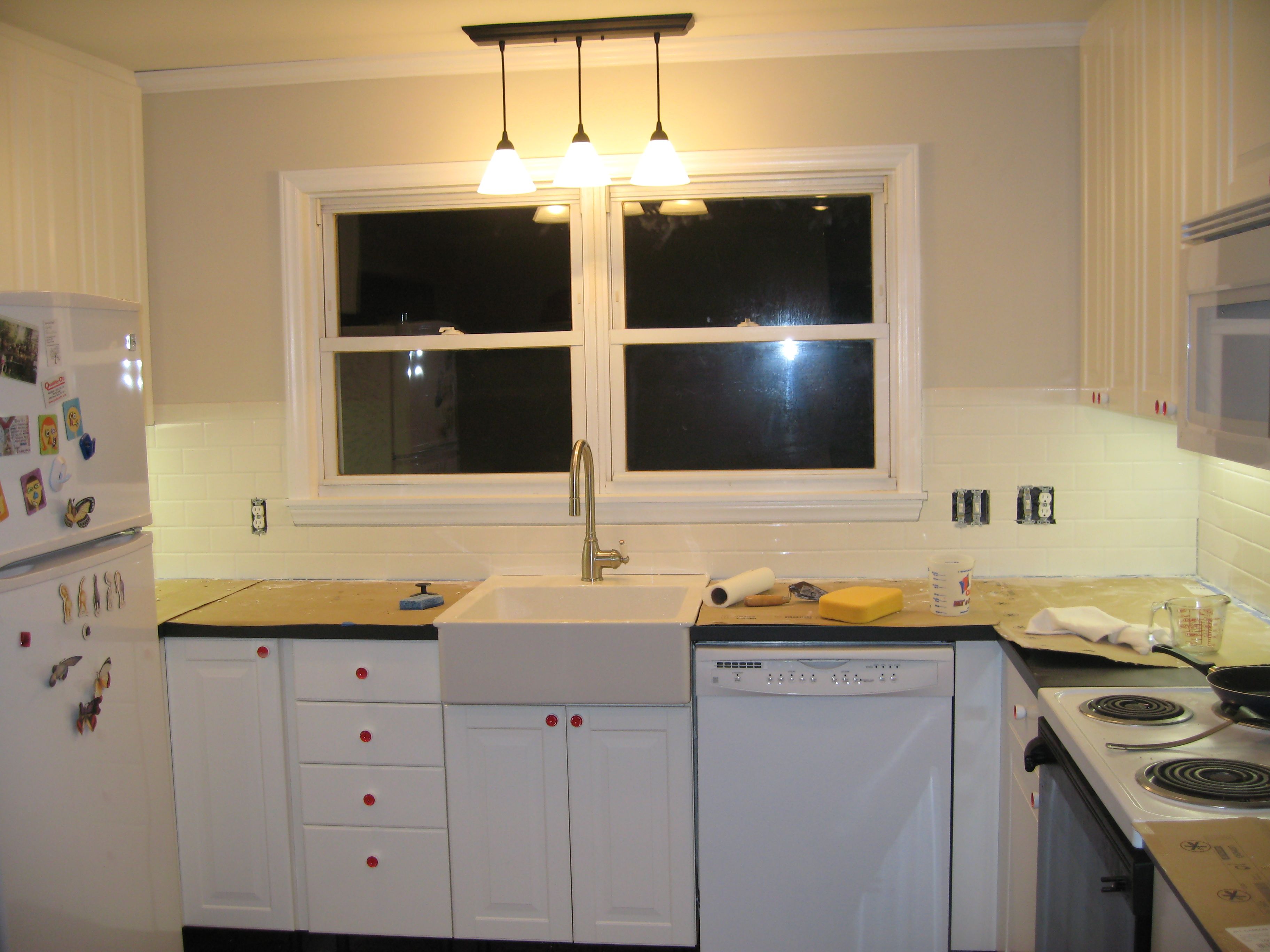 I also tiled the rest of the backsplash area, discovering along the way that my outlets are at very slightly different heights, and also my windows are too, at least in relation to the countertop, which is true level all the way around the room. This meant cutting tiles in a variety of different shapes, but I got them all in eventually. Then I got to grout, and made a ridiculous rookie mistake – never mix more grout than you can use in half an hour. It hardens, it’s really hard to mix in large quantities, and you end up having to buy a whole second box of grout when the first one should’ve been more than enough. Argh. But I did get the whole kitchen grouted, and now the backsplash recedes into a solid wall of white, instead of being a strongly patterned wall where you can see all the spaces between tiles really well.